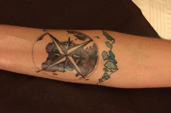 男生手臂上彩绘几何线条世界地图和指南针纹身图片