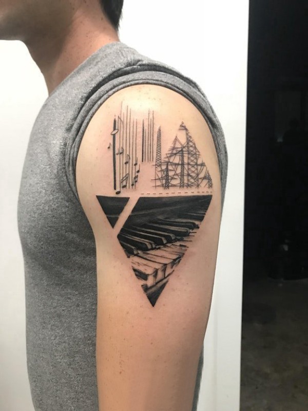 男生大臂上黑色点刺几何线条钢琴纹身图片