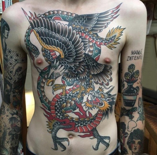 男生腹部彩绘水彩素描创意霸气老鹰纹身图片