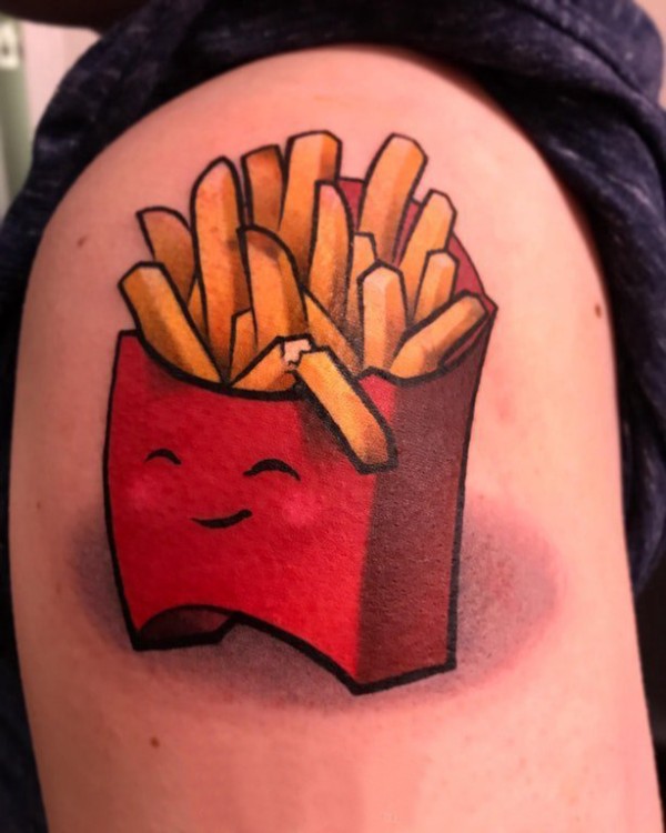 男生大臂上彩绘渐变几何线条食物薯条纹身图片