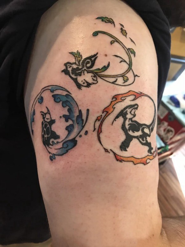 男生大臂上彩绘渐变抽象线条卡通小动物纹身图片