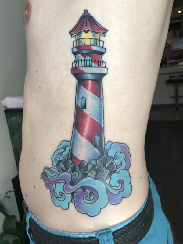 男生侧腰上彩绘渐变简单线条海浪和灯塔纹身图片