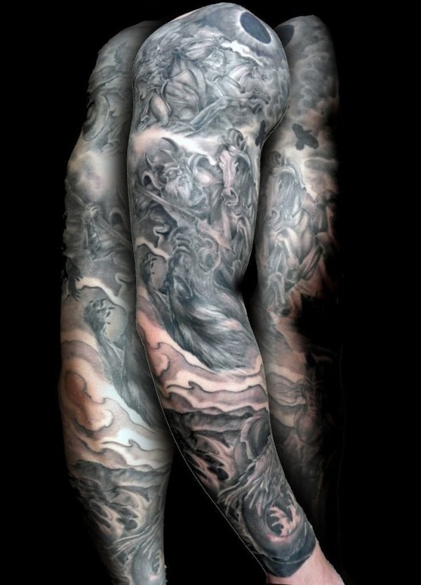 多款男生手臂上黑色线条素描点刺技巧霸气花臂纹身图案