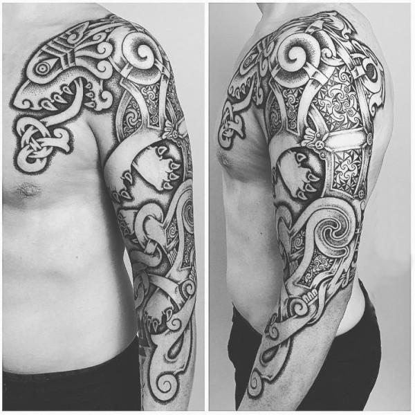 多款男生手臂上黑色线条素描点刺技巧霸气花臂纹身图案