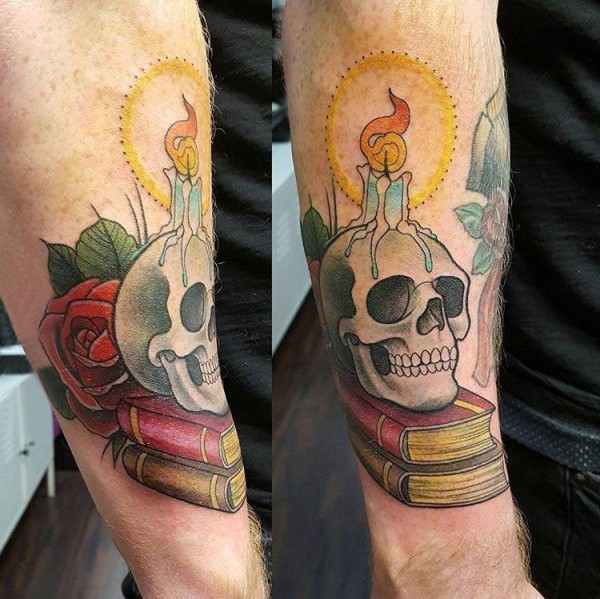 女生手臂经典潮流的骷髅与玫瑰花纹身图案