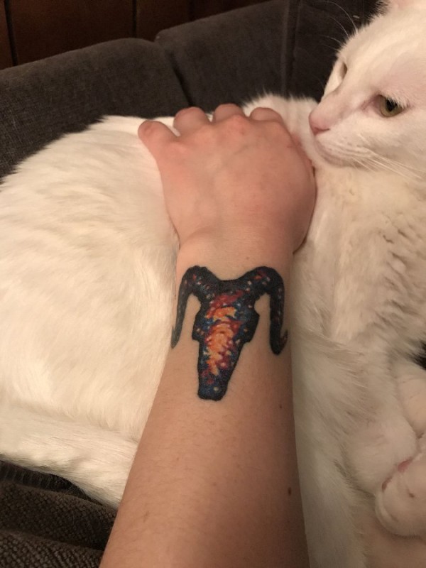 男生手臂上彩绘水彩素描文艺霸气羊头纹身图片