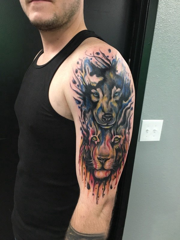 男生手臂上彩绘水彩素描泼墨霸气狼和狮子纹身图片