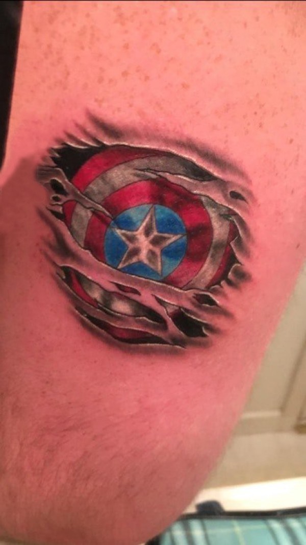 男生手臂上彩绘裂痕美国队长盾牌纹身图片