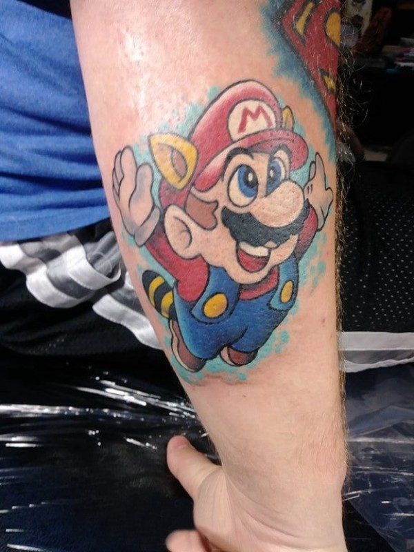 男生手臂上彩绘简单线条可爱卡通超级玛丽纹身图片
