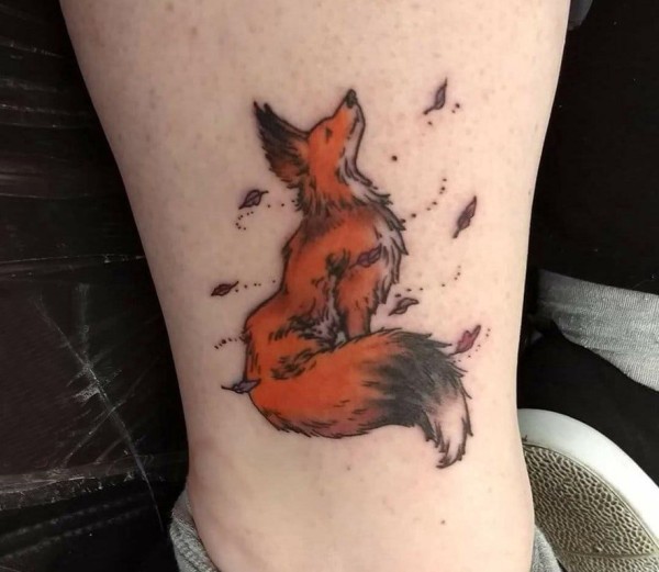 男生小腿上彩绘渐变抽象线条狐狸小动物纹身图片