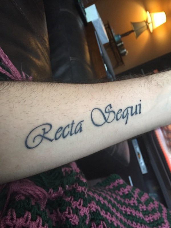 男生手臂上黑色线条文艺小清新有意义花体英文纹身图片