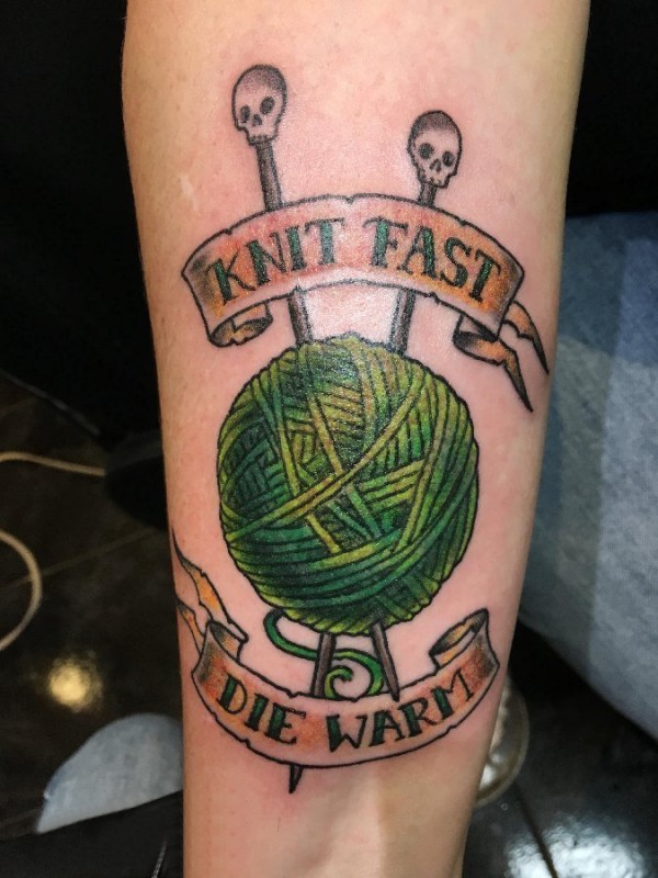 男生手臂上彩绘渐变几何简单线条英文和毛线球纹身图片