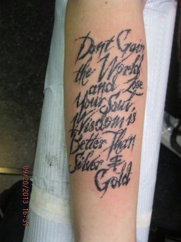 男生手臂上黑色线条文艺经典花体英文纹身图片
