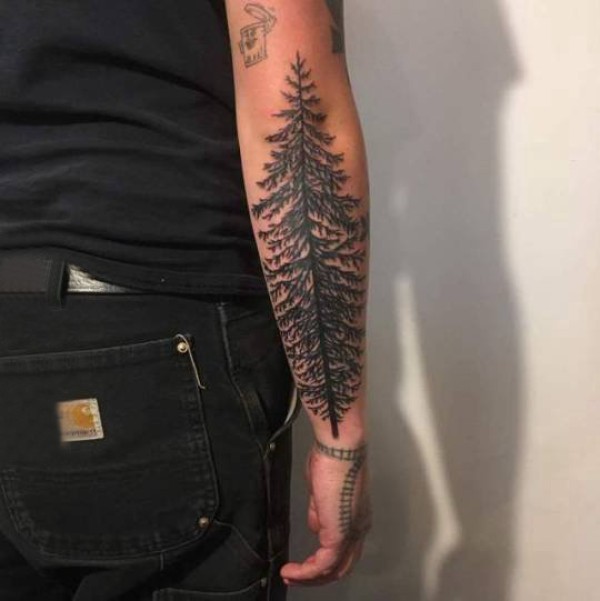 男生手臂上黑色点刺简单线条植物茂密大树纹身图片