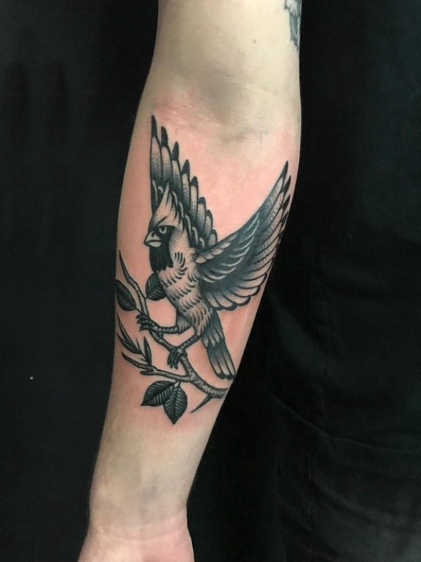 男生手臂上黑灰素描点刺技巧文艺小鸟纹身图片