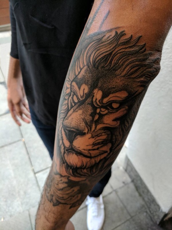 男生手臂上黑色点刺简单抽象线条动物狮子纹身图片