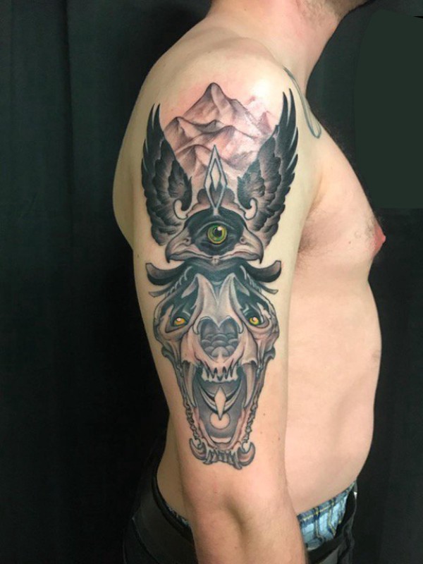 男生手臂上黑灰素描点刺技巧霸气老鹰纹身图片