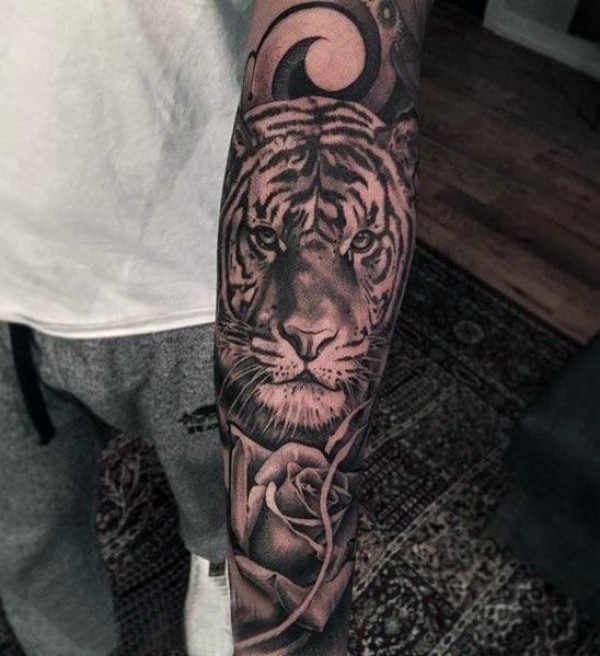 男生手臂上黑灰素描点刺技巧霸气老虎 花臂纹身图片