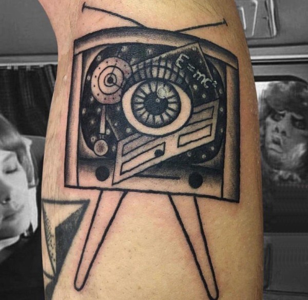 男生小腿上黑色点刺几何简单线条电视机纹身图片