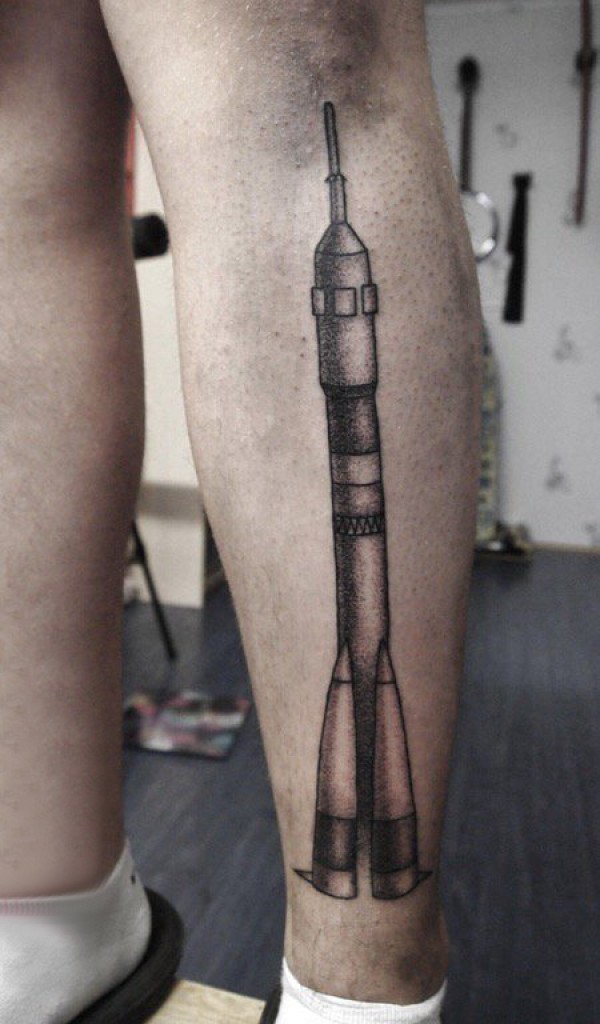 男生小腿上黑灰素描点刺技巧宇宙飞船纹身图片