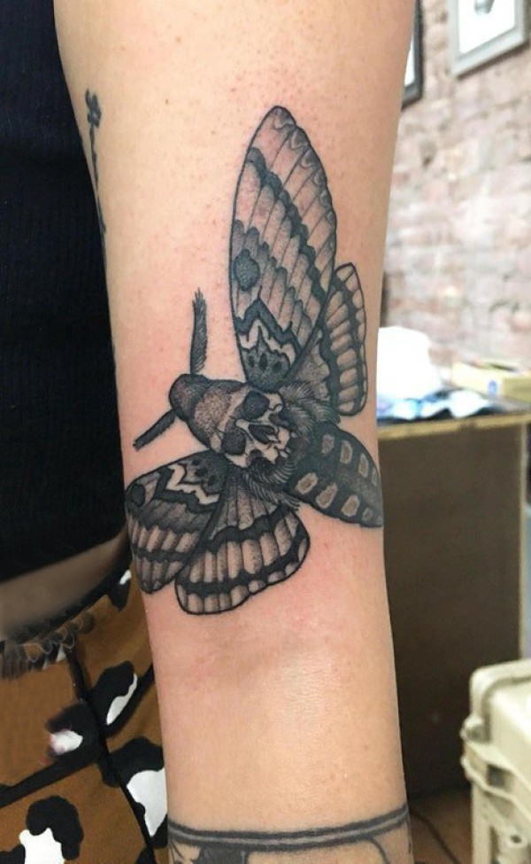 女生手臂上黑色点刺简单线条骷髅型蝴蝶纹身图片