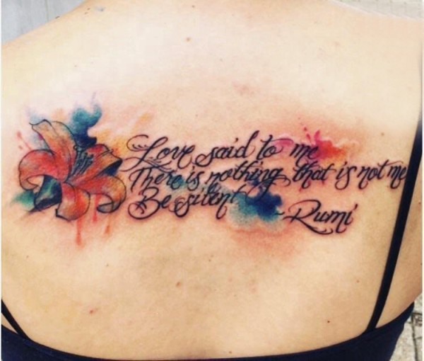 女生后背上彩绘泼墨简单个性线条英文和植物花朵纹身图片