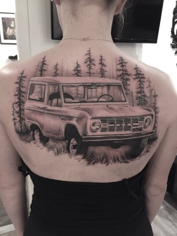 女生背部黑灰素描点刺技巧霸气汽车风景纹身图片