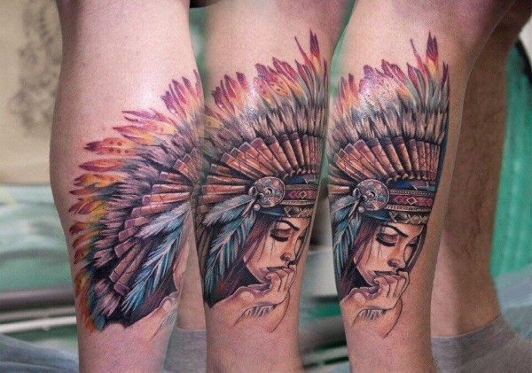 男生小腿上彩绘渐变简单线条羽毛和印第安人物纹身图片