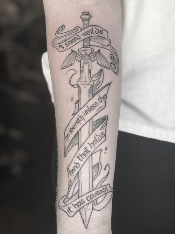 女生手臂上黑灰点刺简单线条英文和长剑纹身图片