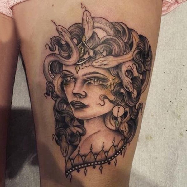 女生大腿上黑灰素描点刺技巧霸气精致女生人物纹身图片