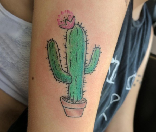 女生大臂上彩绘渐变简单线条小清新植物仙人掌纹身图片
