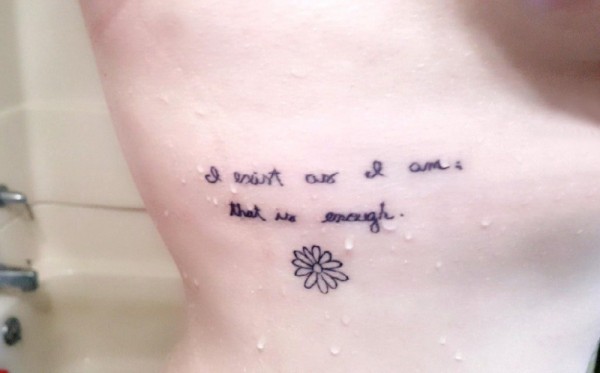 女生侧腰上黑色简单抽象线条英文和花朵纹身图片