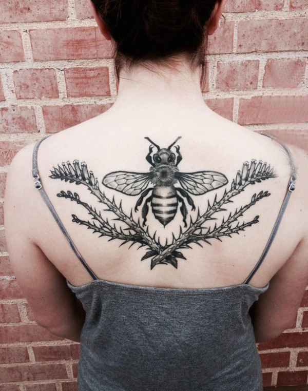 女生背部黑色线条素描文艺唯美昆虫纹身图片