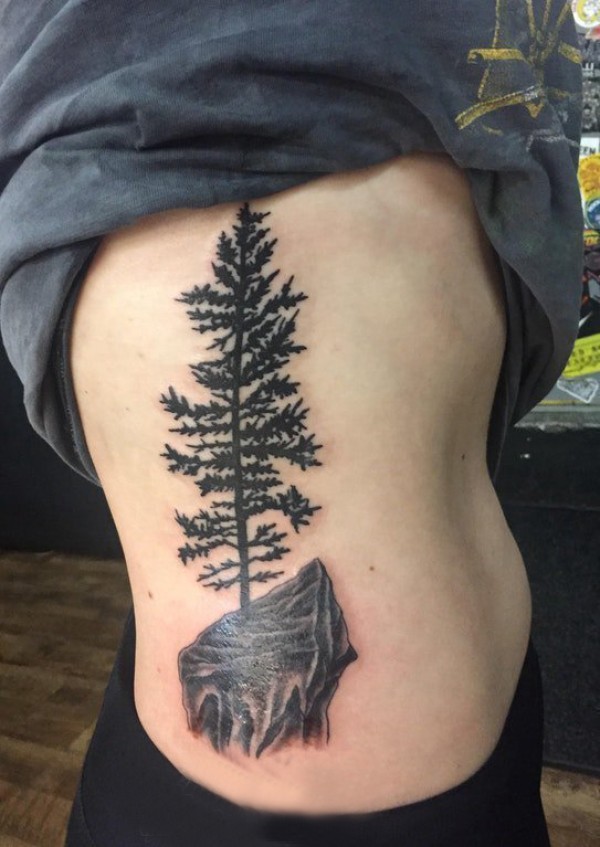 女生侧腰上黑色点刺简单线条岩石和植物大树纹身图片