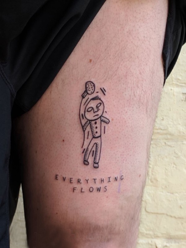 男生大腿上黑灰点刺简单线条英文和卡通人物纹身图片