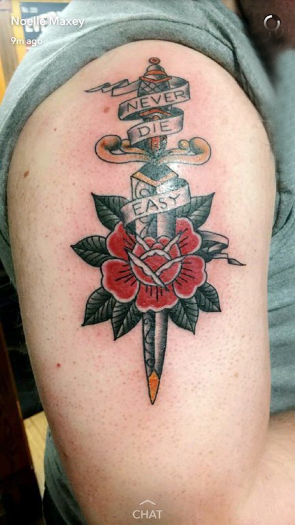 男生手臂上彩绘水彩素描文艺唯美花朵霸气匕首纹身图片