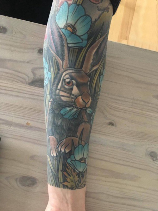 男生手臂上彩绘水彩素描可爱兔子花臂纹身图片