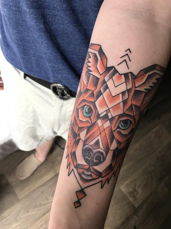 男生手臂上彩绘渐变几何简单线条小动物狗纹身图片