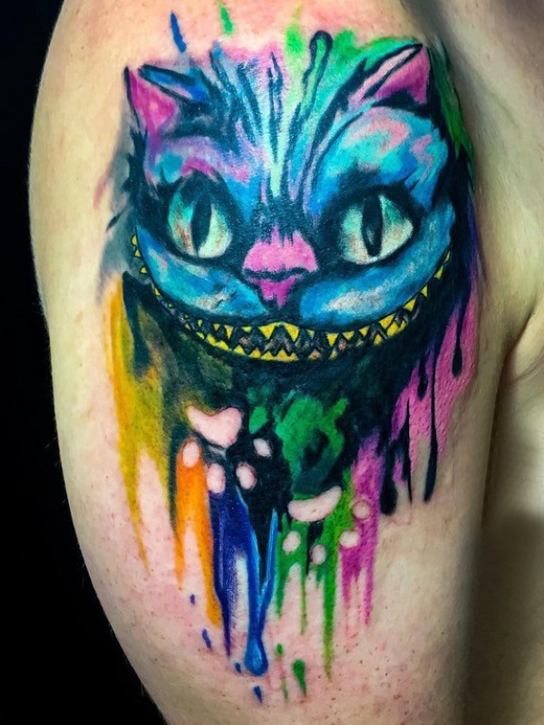 男生大臂上彩绘泼墨简单抽象线条猫咪动物纹身图片