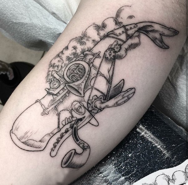 男生手臂上黑灰点刺简单抽象线条乐器和鲸鱼纹身图片