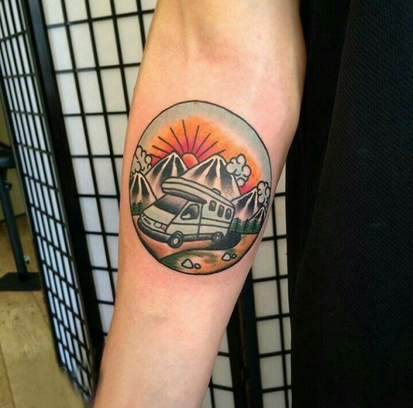 男生手臂上彩绘水彩素描文艺风景圆形纹身图片