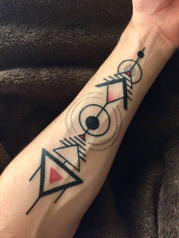 男生手臂上彩绘水彩素描几何元素经典图腾纹身图片
