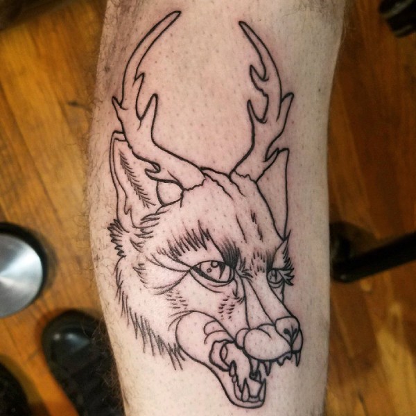 男生手臂上黑色简单线条鹿角和狼纹身图片