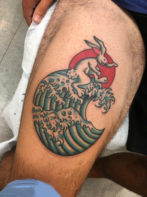 男生大腿上彩绘渐变几何抽象线条浪花和兔子纹身图片
