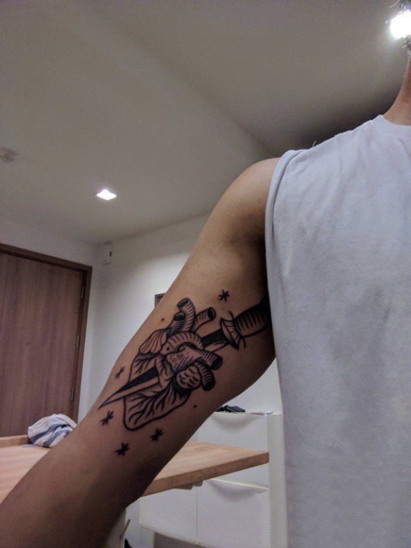 男生手臂上黑灰素描点刺技巧霸气心脏匕首纹身图片