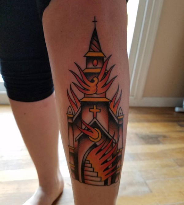 男生小腿上彩绘水彩素描霸气建筑纹身图片