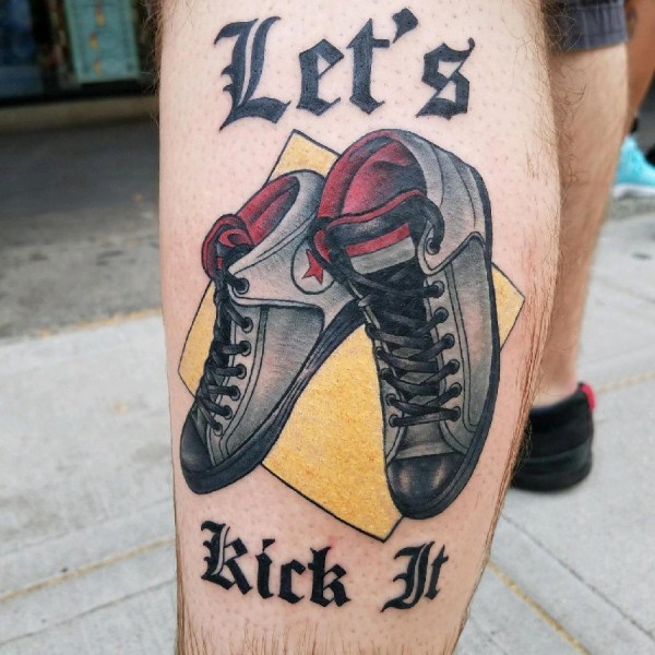 男生小腿上彩绘几何简单线条英文和鞋子纹身图片