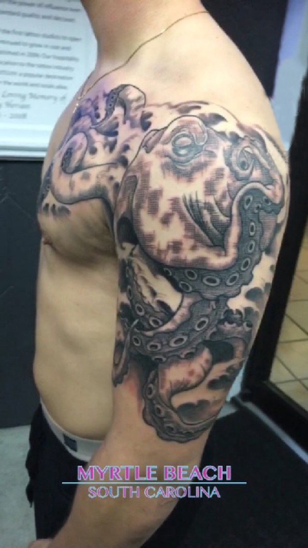男生手臂上黑灰素描点刺技巧霸气章鱼动物纹身图片
