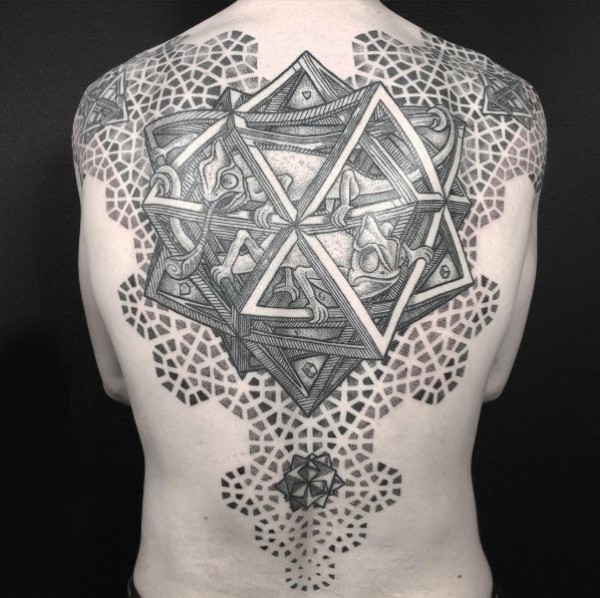 男生背部黑灰素描点刺技巧几何元素大面积霸气纹身图片