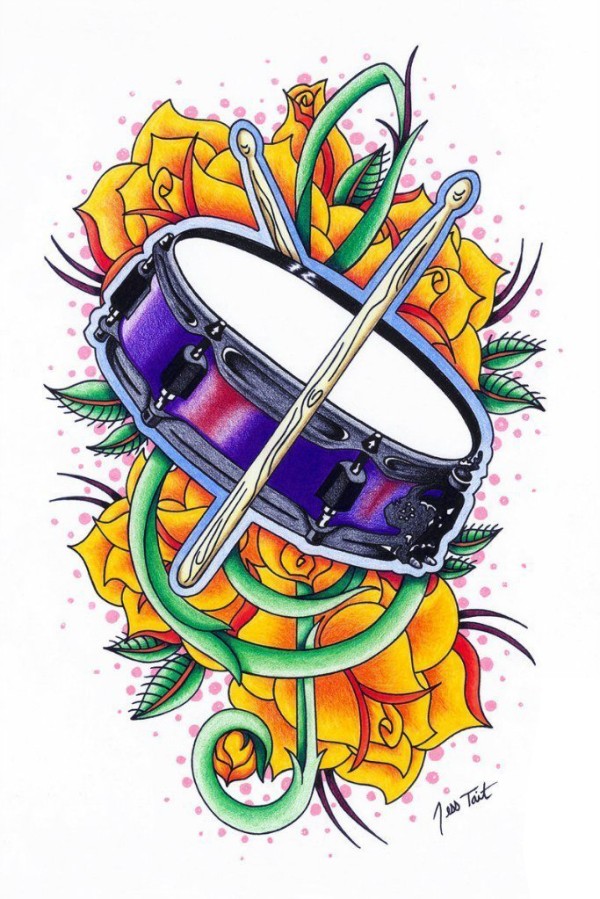 彩绘水彩素描唯美玫瑰文艺鼓乐器纹身手稿